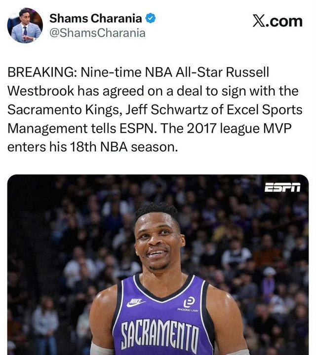 据nba“爆料大王”Shams Charania透露,威斯布鲁克已经与国王队达成协议,将在萨克拉门托开启生涯第18个赛季,这也将是他职业生涯效力的第8支球队(包含犹他爵士)。